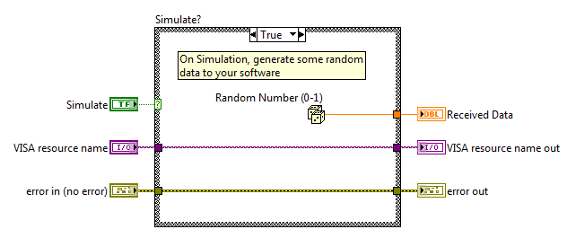 If your module uses a hardware to get some data (example voltage measurement), then you can create a simulation code as shown below. The "True" case of the case structure is the simulation code which gives the random number and "False" case of the case structure will get actual data from instrument.