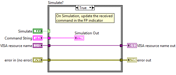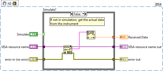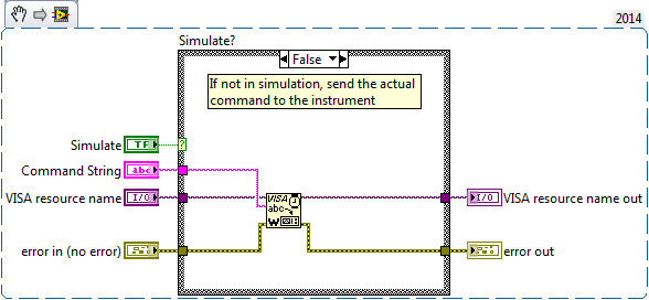 Adding simulation codes to such software would help a lot avoiding such stopping-points of software testing. The key to simulation is usage of a simple boolean input and case structure which decides to use whether the simulation code or real hardware code.