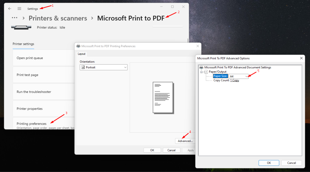To fix the printer property (Microsoft Print to PDF printer in this case), go through the following in image below.