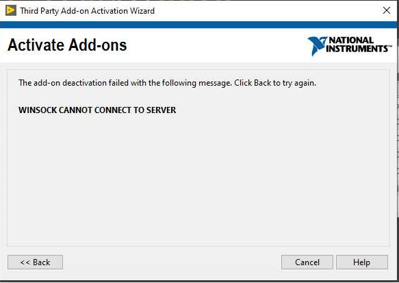 Deactivation or Activation IssueCreated OnNovember 29, 2021UpdatedNovember 29, 2021byAjayvignesh MV When I try to deactivate the product I have some issues like below. Activate Add-ons Issue (One or more required input elements are missing) Activate Add-ons (Winsock cannot connect to server) Solution Check if the internet connection is proper to the machine in order to activate the toolkit.Contact NI for tools support